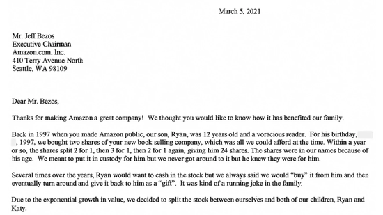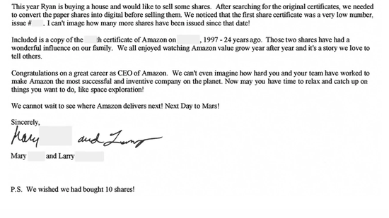 一路走来,我们为股东创造了1.6万亿美元的财富。他们是谁?当然,我所持有的亚马逊股份使我变得富有。但超过八分之七的股份,也就相当于1.4万亿美元的财富,为他人所有。他们是谁?是养老基金、大学、401(K)退休福利计划,也是Mary和拉里,他们在我坐下来写这封股东信的时候,意外地给我发来了以下这封信: