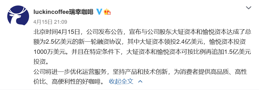 4月15日晚间,瑞幸咖啡发布公告,宣布与公司股东大钲资本和愉悦资本达成了总额为2.5亿美元的新一轮融资协议。