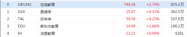 部分在线教育股大涨,跟谁学涨4.33%,公司宣布将于北京时间4月22日举办投资者日活动;好未来涨4.23%,新东方教育涨近2%。