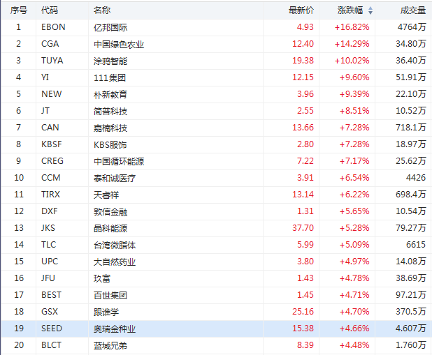 中概股中,区块链概念股亿邦国际涨幅领先,截至发稿涨近17%,同板块嘉楠科技涨超7%;涂鸦智能涨超10%。