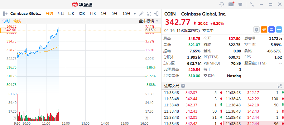 华盛资讯4月16日消息,美股盘中,美国加密货币交易所Coinbase股价持续拉升,截至发稿涨超6%,报342.77元,最新市值超680亿美元。
