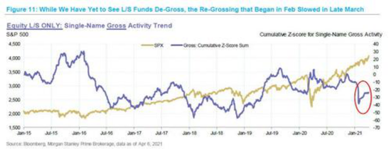 在整个2020年期间,做多成长股/做空价值股是比较有效的交易之一,这两个因素是去年alpha值强劲上升背后的主要驱动因素之一。然而,2021年的情况却大不相同,这两个因素现在是美国多/空头寸总回报率最大的不利因素。这种不利情况开始于2020年末,但直到上个月才开始看到对冲基金积极地从成长股转向价值股。