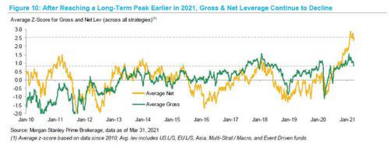 值得参考的是,今年1月底,总杠杆率接近2010年以来的最高水平(与2018年1月最后一周一致)。在今年2月中旬达到2010年以来的高点后,各策略的净杠杆率在3月份也从月初的2.7下降到月底的2.5 。这背后的主要推动力是多策略/宏观基金和亚洲基金,两种策略的净杠杆率分别下降了8%和4%。