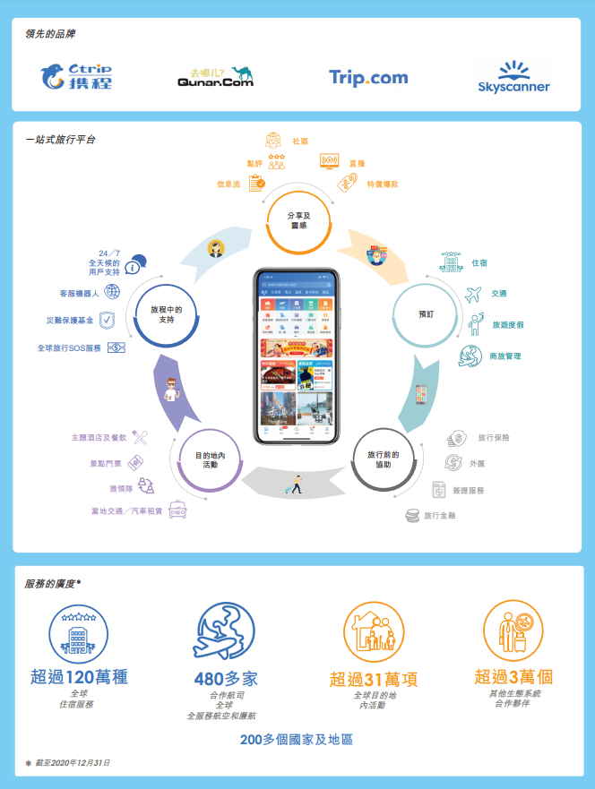 截至2020年12月31日,携程与全球120万个住宿伙伴合作,提供涵盖酒店、度假村、住宅、公寓、民宿、招待所等全品类住宿产品;与480余家航空公司合作,为用户提供覆盖200多个国家及地区的超过2600个机场的机票产品。