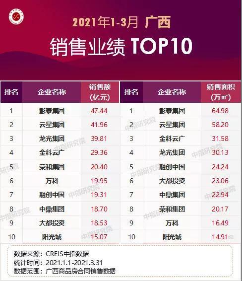 另据中指数据显示,2021年一季度市场成交热度回升,房企销售速度加快。广西房企TOP10销售金额为270.53亿元,其中彰泰集团以47.44亿元居首位。