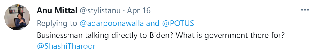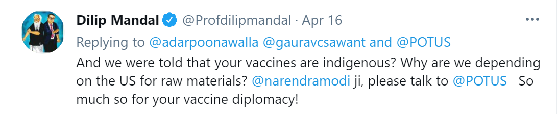 还有网友质疑:“我们被告知疫苗是本土的,为什么我们的原材料要依靠美国呢?莫迪总理,请跟拜登谈谈。”↓