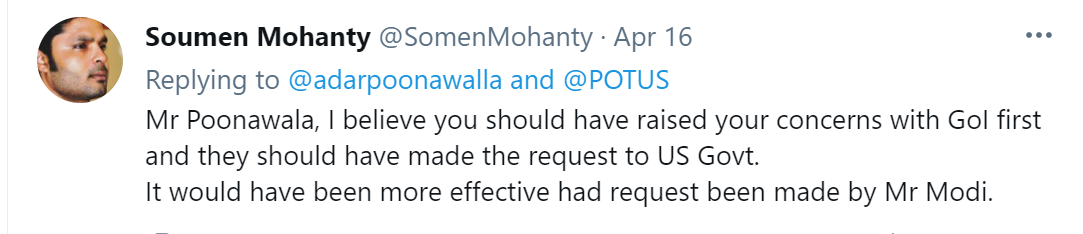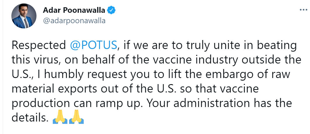 “尊敬的美国总统,如果我们真的需要团结起来战胜这个病毒,我谨代表美国以外的疫苗生产商,谦卑地请求你解除对疫苗原材料的出口禁运,以便提高疫苗产量。”普纳瓦拉16日在推文中写道。