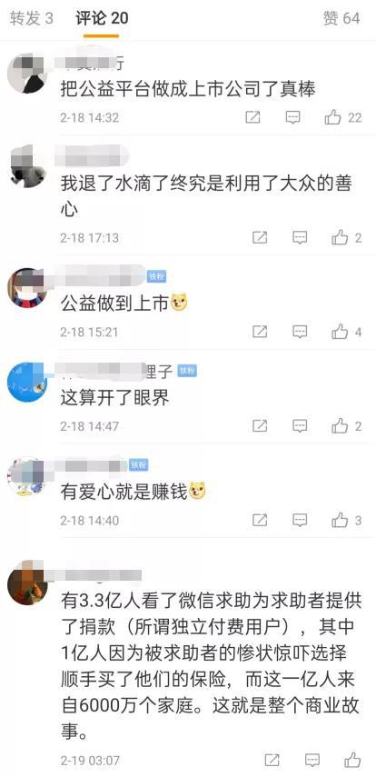 靠水滴筹的公益招牌引流,靠保险业务赚钱,这种模式也引来不少质疑。