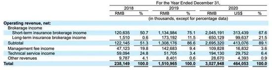 水滴公司的营收从2018年的2.381亿元增长到2019年的15.110亿元,增幅为534.6%,2020年进一步增长100.4%,达到30.279亿元。保险佣金收入分别为1.22亿、13.08亿和26.95亿元,在总营收中占比分别达51.3%、86.6%、89.1%。