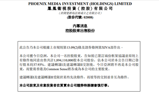 新浪科技讯 北京时间4月19日早间消息,凤凰卫视在港交所公告称,公司获公司的一名控股股东,告知彼已签订两份框架协议并原则上有条件地同意出售共计1,894,110,000股本公司股份,占公司于本公告日期已发行股本约37.93%。待交割完成后,今日亚洲将不再是公司股东,而紫荆香港及Common Sense将各成为公司的主要股东,分别持有公司于本公告日期已发行股本约21%及16.93%。