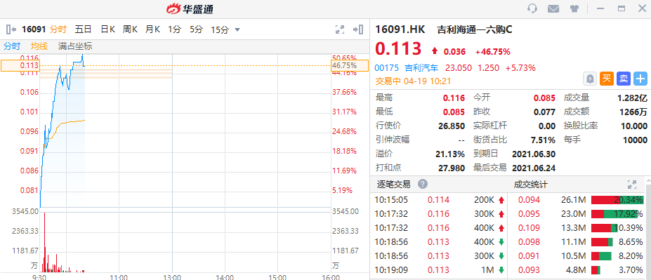 相关窝轮方面,吉利海通—六购C大涨46.75%,成交额1266万港元,其行使价为26.85港元,2021年06月30日到期,溢价率达21.13%。