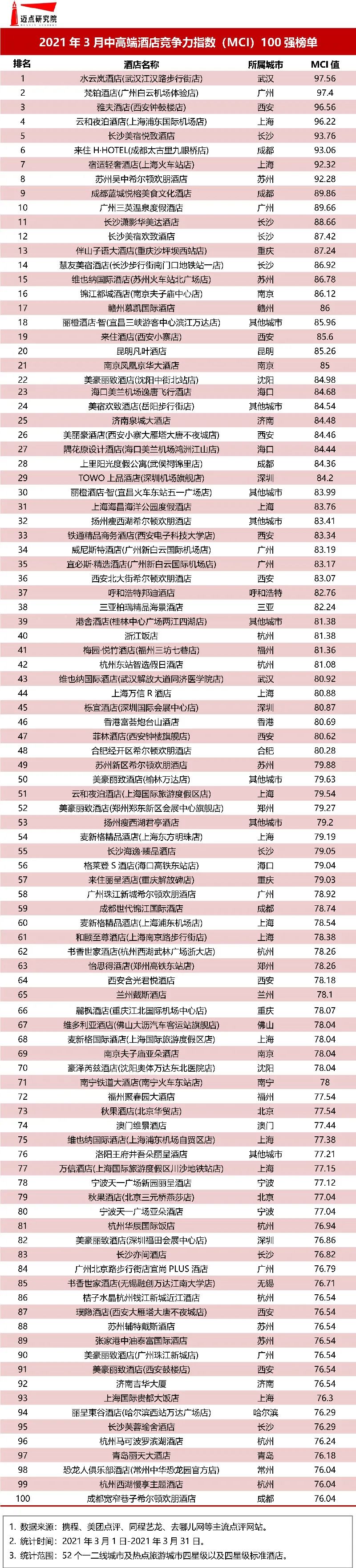 “2021年3月中高端酒店竞争力指数100强榜单”数据来源于迈点酒店竞争力指数(MCI),根据3月迈点酒店竞争力指数(MCI)的9767家中高端酒店数据汇总统计而成。具体说明如下: