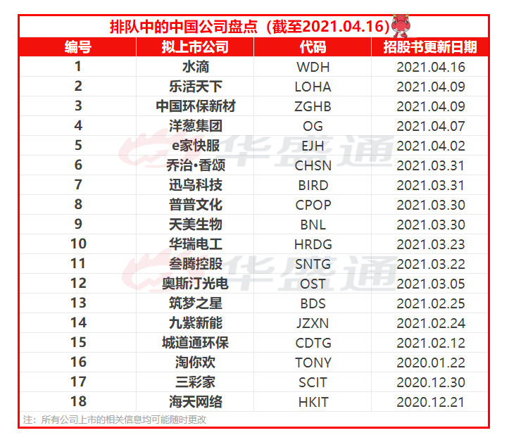 除了预计上市的这8只新股外,还有一批中国公司正在SEC排队等待上市,也是看点十足(详见下表),目前市场上关注度较高的是水滴公司和跨境电商平台洋葱集团。