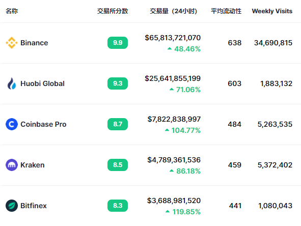 加密货币交易所24小时交易量排名 来源:CoinMarketCap