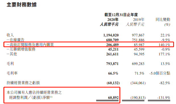 据公司财报数据统计发现,自2013年至2019年,公司累计亏损已经高达121.26亿元人民币(下同)。不过值得欣慰的是,公司在2020年首次实现了经调整利润净额全年盈利的里程碑,利润为6089万元,其中高级订阅服务和应用内购买业务同比暴增140%。