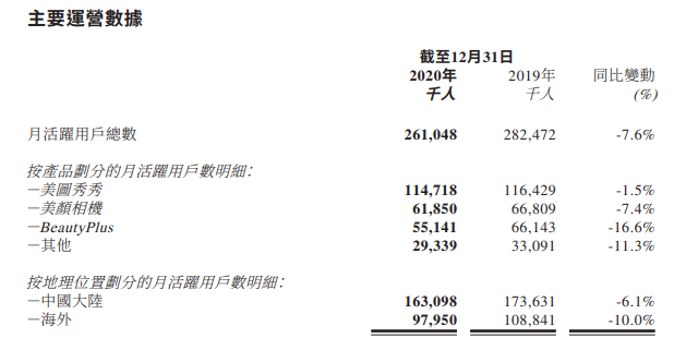 但公司曾经引以为傲的产品用户月活量却持续下滑。2016-2020年美图各产品的月活用户量分别为4.5亿、4.15亿、3.32亿、2.82亿和2.61亿,呈不断下滑的趋势。从产品分类看,美图全线产品的用户月活均出现了一定程度的下滑,形势不容乐观。