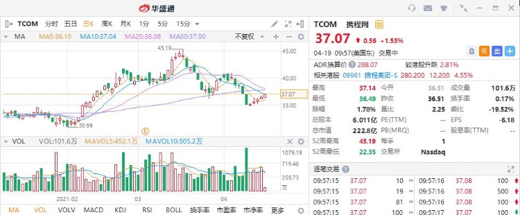 值得注意的是,旅游业反弹的曙光之下,携程美股股价已经冲上高点。2021年3月,携程股价最高破44美元,几乎与2019年同期持平,相较2020年疫情最严重时翻了一番。