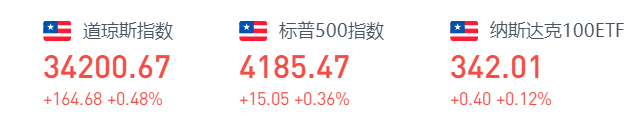 上周五收盘,道琼斯指数涨164.68点,涨幅0.48%,报34200.67点;标普500指数涨15.05点,涨幅0.36%,报4185.47点;纳斯达克综合指数涨13.58点,涨幅0.12%,报14052.34点。道指上周涨1.2%,纳指涨1.1%,标普500指数涨1.4%,报4185。