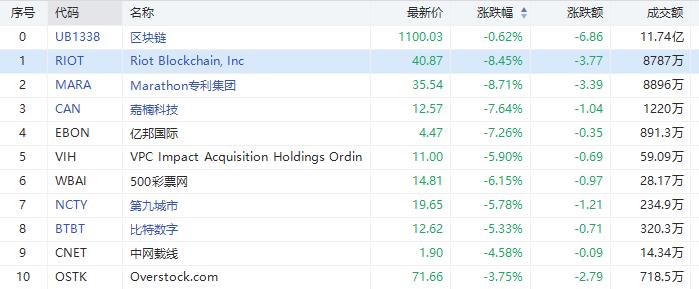 华盛资讯4月19日讯,美股盘初,区块链概念股集体下挫。截至发稿,嘉楠科技(CAN.O)跌超7%,Riot Blockchain(RIOT.O)跌超8%,第九城市(NCTY.O)得近6%。