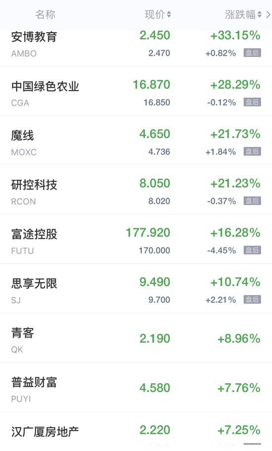 安博教育涨超33%,中国绿色农业涨28%,跟谁学、网易有道涨超4%,金山云、哔哩哔哩涨超2%,唯品会涨超1%。
