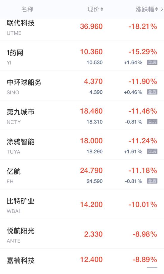 联代科技跌超18%,涂鸦智能跌超11%,达达跌超5%,搜狐跌超4%,腾讯ADR、百度、爱奇艺、腾讯音乐、虎牙、名创优品跌超1%。