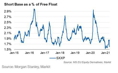 据高盛统计,标普500指数成分股的空头仓位中位数目前仅占市值的1.6%,接近十七年低点。摩根士丹利的数据显示,欧洲空头回补风潮导致看跌仓位以前所未有的速度急剧减少,伴随泛欧Stoxx 600指数升至纪录新高,空头占比降至1.65%,接近历史最低。