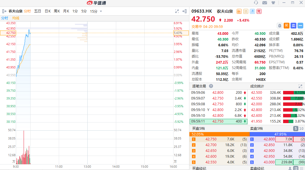 华盛资讯4月20日消息,农夫山泉于昨日正式官宣了旗下新品牌“长白雪”,弥补了公司在3元产品线的空白。截至发稿,农夫山泉涨5.43%,报42.75港元每股,成交额达1.696亿港元,最新总市值4808亿港元。值得注意的是,农夫山泉连续四个交易日不断走高。