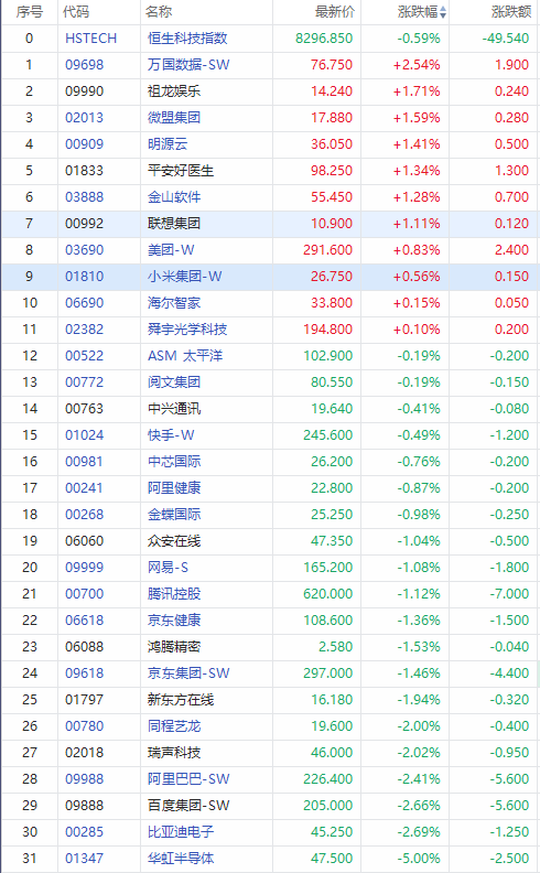明星科技股中,快手跌近1%,腾讯、京东跌超1%,阿里、百度跌超2%。