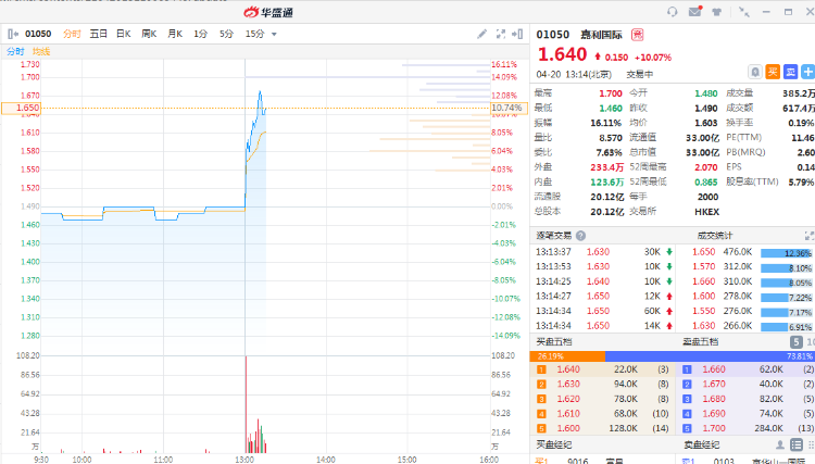 4月20日消息,嘉利国际股价直线拉升涨超10%,报1.64港元。嘉利国际公布,该公司正考虑可能以介绍方式分拆集团房地产业务并于香港联合交易所有限公司主板独立上市。