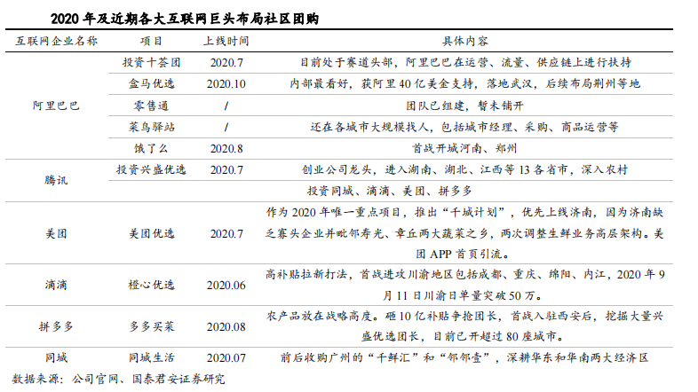 由于疫情催生了社区团购的火爆,去年下半年美团开始推广小区电商模式“美团优选”。但在10月,阿里巴巴集团旗下的“盒马优选”也开始上线,拼多多、京东、苏宁等电商巨头都是社区团购业务的争夺者。不仅如此,此前专注于社区团购业务的公司如十荟团、小区乐、每日一淘等,都占据着一定的市场份额。其中十荟团在去年10月GMV就已经突破10亿,月活用户突破500万。