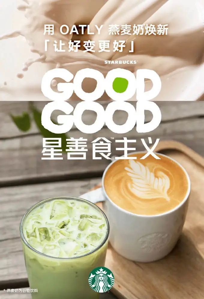去年4月21日,星巴克开始采用“GOODGOOD星善食主义”的品牌slogan,以“一杯给明天的牛奶”,推出以OATLY代替牛奶的燕麦拿铁,对外宣传卖点有三:含膳食纤维,0胆固醇,0反式脂肪酸;乳糖不耐人群友好;为减少碳排放助力,更环保。