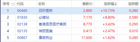 华盛资讯4月20日消息,医美股近期持续受资金热捧。截至发稿,四环医药涨10.73%,必瘦站涨8.8%,香港医思医疗涨3.42%,瑞丽医美涨2.47%,康哲药业涨1.62%。