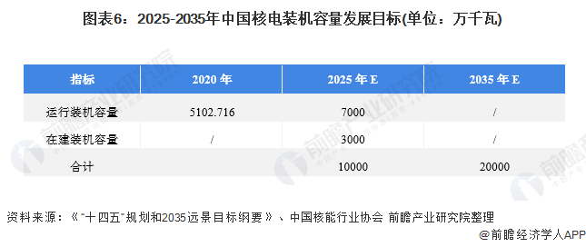 根据《“十四五”规划和2035远景目标纲要》,至2025年,我国核电运行装机容量达到7000万千瓦。此外,根据中国核能行业协会发布的《中国核能年度发展与展望(2020)》中的预测数据显示,到2025年,我国在运核电装机达到7000万千瓦,在建3000万千瓦;到2035年,在运和在建核电装机容量合计将达到2亿千瓦;核电建设有望按照每年6至8台机组稳步推进。