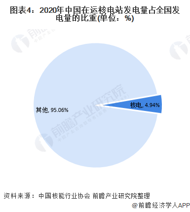 在核电站的生产运营方面,2020年,全国累计发电量为74170.40亿千瓦时,运行核电机组累计发电量为3662.43亿千瓦时,占全国累计发电量的4.94%。