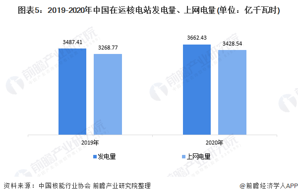 同时,与2019年相比,2020年我国核电站的发电量、上网电量均有所增长,其中,发电量同比增长5.02%,上网电量同比增长4.89%。