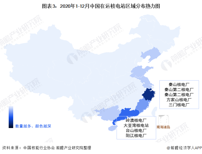 从区域分布来看,目前我国所有在运核电站均分布在沿海地区。其中,浙江省的核电站数量最多,达5个;其次是广东省,共有4个核电站,而我国核电站建设进程中的第一个、第二个核电站分别位于浙江省、广东省。