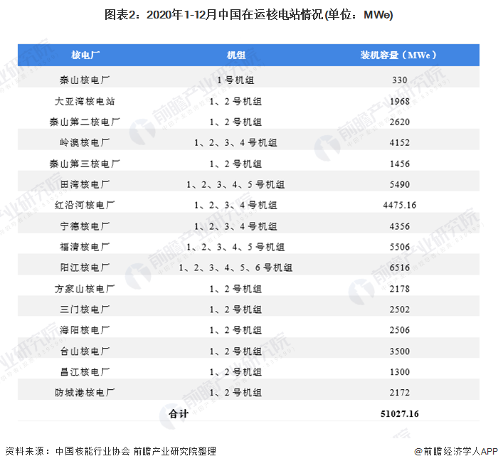 截至2020年末,中国共有16座核电站投入运行,运行核电机组达49台,总装机容量达51027.16MWe。其中,装机容量排名前三的是阳江核电厂、福清核电厂、田湾核电厂。