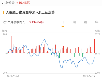 北上资金今日净流入19.46亿元,周一为净流入超190亿元。