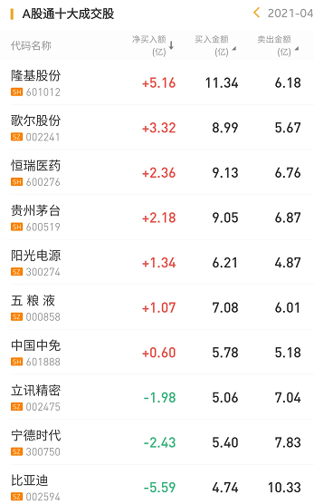 北上资金今日净买入隆基股份5.16亿元,为今日买入之最。其次,净买入歌尔股份3.32亿元。