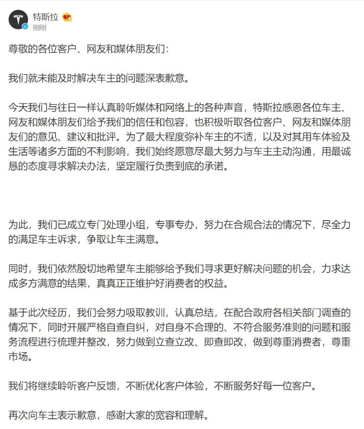 特斯拉(TSLA.O)官博:特斯拉尊重并坚定服从政府各相关部门的决定,尊重消费者,遵守法律法规,坚决坚定地积极配合政府各相关部门的所有调查。为此,我们已成立专门处理小组,专事专办,努力在合规合法的情况下,尽全力的满足车主诉求,争取让车主满意。