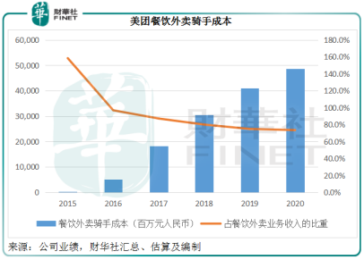 然而,餐饮外卖骑手成本是美团占比最大的成本。2020年,这笔开支达到486.92亿元,相当于该公司总收入的42.42%。