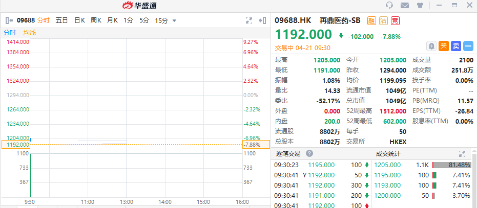 再鼎医药去年9月在香港第二上市,其港股周二暂停买卖,停牌前周一收报1,294港元。其ADS周二收低逾8.25%报150.77美元。