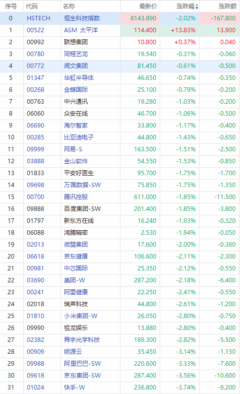 其中,ASM太平洋逆市涨超13%,今日公布首季股东应占盈利约同比增长21倍;其他成分股,腾讯、百度跌超1%,美团、小米跌超2%,阿里、京东、快手跌超3%。
