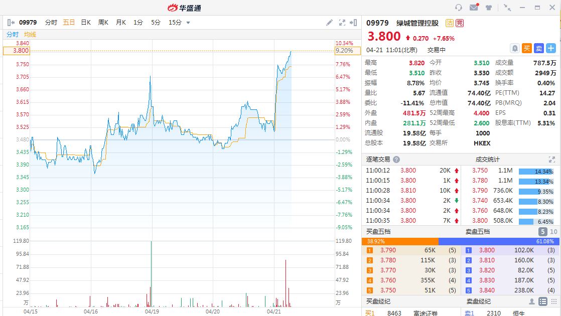 华盛资讯4月21日消息,绿城管理控股(09979.HK)股价高位震荡,截至发稿,报3.8港元,涨幅7.65%,最新总市值74.4亿港元。