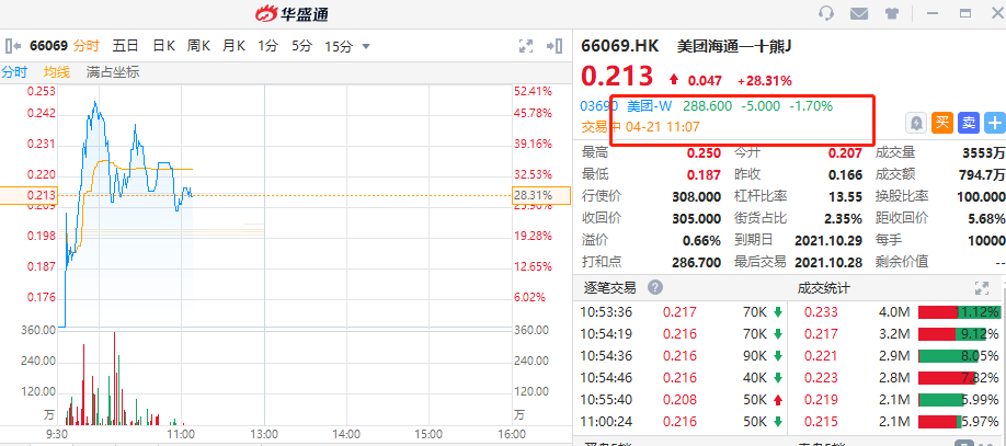 相关窝轮方面,美团海通一十熊J大涨28.31%,成交额794.7万港元,其收回价为305港元,2021年10月29日到期,溢价率0.66%。