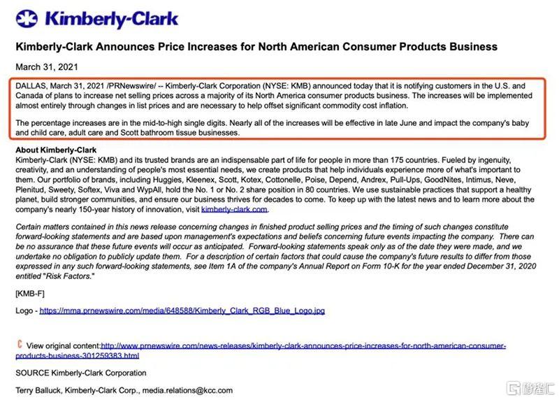通胀压力已经从下游传导至上游。全球最大纸制品生产商之一金佰利(KimberlyClark)3月宣布,将开始上调大部分北美地区产品的价格,以帮助应对原材料上涨压力,这一举措将在6月下旬生效。