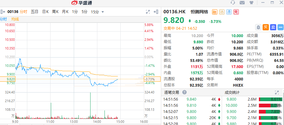 华盛资讯4月21日消息,昨日恒腾网络在港交所发布公告称,公司附属公司北京晓明(南瓜电影运营主体)于4月19日与腾讯科技订立合作协议。南瓜电影将与腾讯视频深度合作,届时南瓜电影将获得腾讯独家版权的海量影视作品授权,供会员观赏。今日恒腾网络低开后震荡下行。截至发稿,恒腾网络下跌超3%,现报每股9.82港元,总市值906.8亿港元。