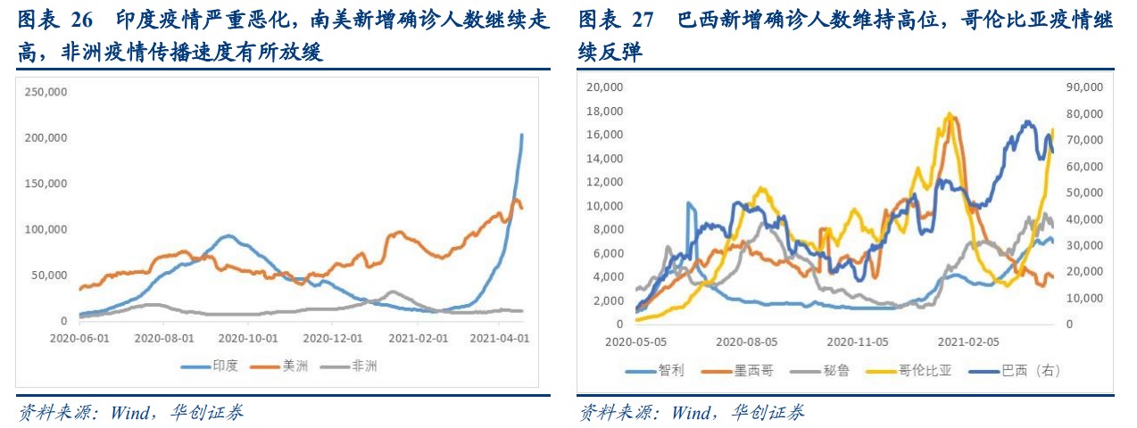 新兴国家方面,南美新增确诊人数略有回落,但整体依旧维持高位,平均新增确诊人数达到12.8万人左右;印度疫情快速恶化,平均新增确诊人数增加7万人至20.3万人左右;非洲疫情传播速度相对缓慢。