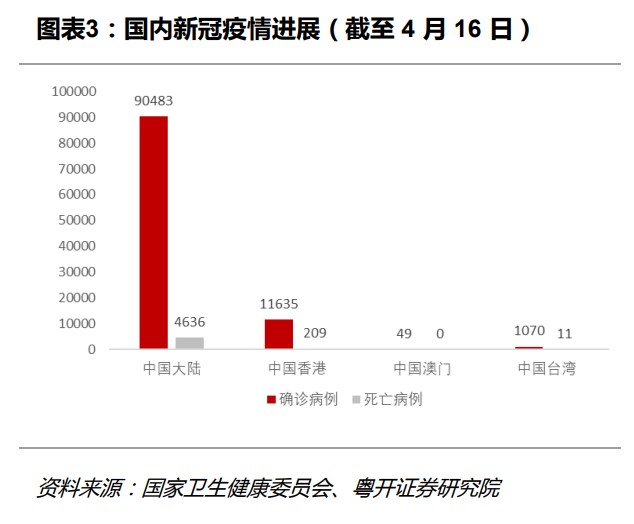 截至4月16日24 时,据31个省(自治区、直辖市)和新疆生产建设兵团报告,现有确诊病例309例(其中重症病例4例),累计治愈出陊病例85538例,累计死亡病例4636例,累计报告确诊病例90483例,现有疑似病例2例。累计追踪到密切接触者1002045人,尚在医学观察的密切接触者10628 人。累计收到港澳台地区通报确诊病例12754例。其中,香港特别行政区11635例(出陊11253例,死亡209例),澳门特别行政区49例(出陊48例),台湾地区1070例(出陊1032例,死亡11例)。当前国内疫情防控基本得到全面控制。