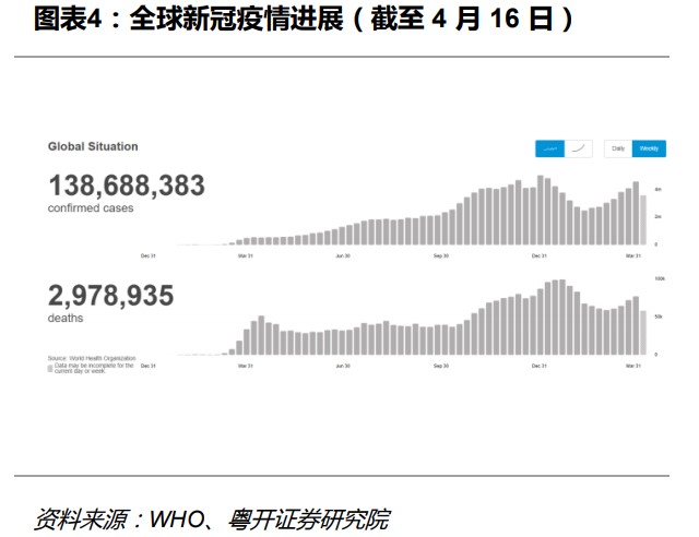 根据 WHO 的统计,至 4 月 16 日,全球累计报告确诊病例 1.38 亿例,累计死亡病例 297 万例。至 4 月 14 日,共 7.5 亿剂新冠疫苗已被接种。